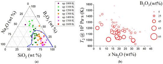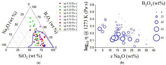 Figure 11a shows the logarithm of viscosity η for 58 NBS glasses at a temperature of 1273 K. As shown in Figure 11b, the logarithm of viscosity at 1273 K decreases with the Na2O content and, in general, for a given sodium oxide content, the logarithm of viscosity increases with a decrease in B2O3 [112,113].