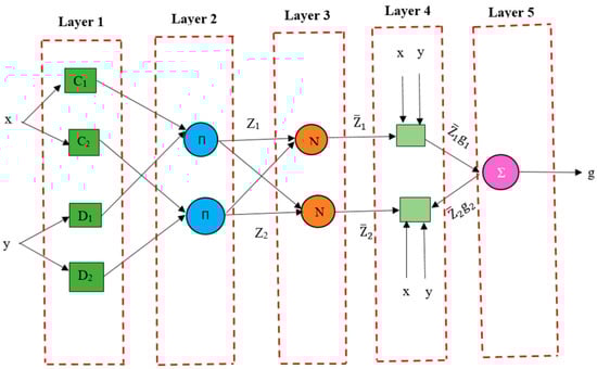 where x and y are the two inputs, and C1, C2, D1 and D2 are membership functions (MF) linked with inputs x and y linked with the node function. The parameters r1, s1, t1 and r2, s2, t2 are linked with output functions g1 and g2, respectively. A typical ANFIS structure is shown in Figure 1, which shows that an ANFIS model contains five layers. The purpose of each of these layers is designated below: