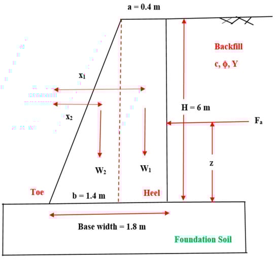 where MR and MO indicate the resisting moment and overturning moment, respectively, W1 and W2 are the element weights of the gravity retaining wall (GRW), x1 and x2 are the horizontal lever distance from the toe wall, z is the vertical lever distance and Fa is the total active thrust per meter run of the wall. In this work, a classical earth pressure theory, namely Rankine’s theory, is used to compute total active force, which is established on the assumption that the there is no friction between rear of the wall and backfill. For the backfill properties with c, φ and Υ, Fa is given by