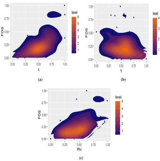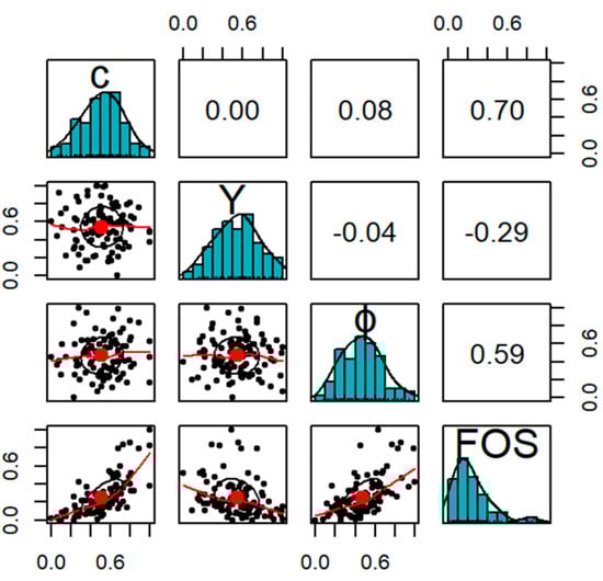Correlation plot among input variables (c, ϒ, φ) and response variable (FOS).