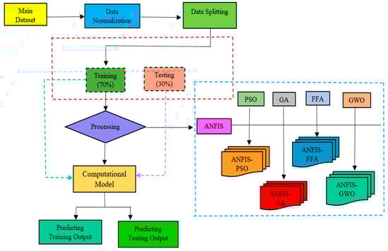 Stage 3: In this stage, data are processed, and learning and validation is performed. Four AI models, namely ANFIS-PSO, ANFIS-GA, ANFIS-FFA and ANFIS-GWO, were trained using the training dataset. Statistical performance parameters were used to validate the model.