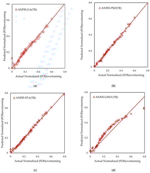 Plot of actual and predicted FOS of training data (TR) for (a) ANFIS−GA; (b) ANFIS−PSO; (c) ANFIS−FFA; and (d) ANFIS−GWO models.