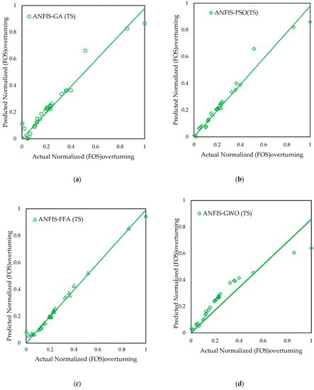Plot of actual and predicted FOS of testing data (TS) for (a) ANFIS−GA; (b) ANFIS−PSO; (c) ANFIS−FFA; and (d) ANFIS−GWO models.