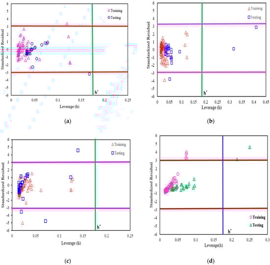 Williams plot for hybrid ANFIS model: (a) ANFIS−PSO, (b) ANFIS−FFA, (c) ANFIS−GA and (d) ANFIS−GWO.