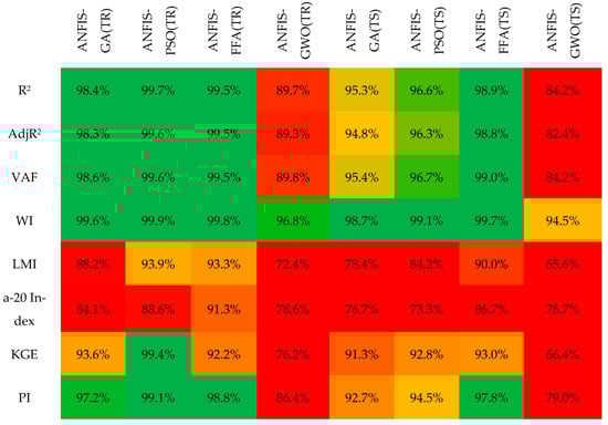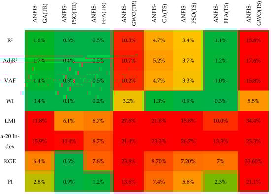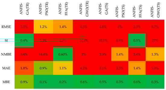 Figure 9 indicates the accuracy matrix of the developed hybrid models for both training and testing dataset. From the accuracy matrix plot, we can see that ANFIS-PSO has higher accuracy as compared to other three model for the training dataset but the difference is minimal in case of ANFIS-PSO and ANFIS-FFA. On the other hand, for testing dataset, it has been observed that higher accuracy achieved in ANFIS-FFA model as compared to the other three models but again difference is minimal in the case of ANFIS-FFA and ANFIS-PSO. In all four models, ANFIS-GWO has the least accuracy for both training and testing dataset. The highest range of accuracy is shown by green color and lowest range of accuracy is indicated by red color. Figure 10 and Figure 11 shows the error matrix for error measuring and trend measuring parameters, respectively. In Figure 10, error is computed for both training and testing datasets by considering error measuring parameters, namely RMSE, SI, NMBE, MAE and MBE. ANFIS-FFA has the lowest error based on error measuring parameters out of all four models. The lowermost range of error is shown by green color and maximum error by red color. ANFIS-GWO model is again shown to be the worst-performing model among all four hybrid models because of attainment of maximum error. Figure 11 indicates error matrix (based on trend measuring parameters) of the established hybrid models for the training and testing dataset. The lowest error recorded for ANFIS-PSO model as compared to all three models (ANFIS-FFA, ANFIS-GA and ANFIS-GWO) but ANFIS-PSO model has also shows better prediction as it has lower value of trend measuring error. As usual, ANFIS-GWO has the highest amount of error among all four developed models. In Figure 11, the lowest range of error is depicted in green color, the highest error in red color and moderate error in yellow color. Overall, we can say ANFIS-PSO has better prediction for the training dataset (as it has high accuracy and lowermost error) and ANFIS-FFA has better prediction power for the testing dataset due to it having the highest accuracy and lowermost error for testing dataset.
