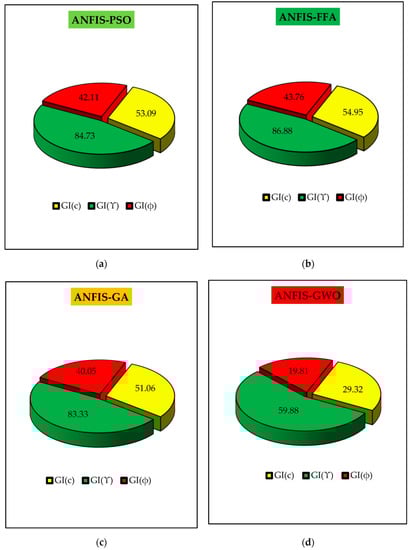 In Figure 12, the relative significance of each input variable is shown by means of their Gini index. For all four proposed hybrid models, the Gini index values for all three input parameters, namely c, ϒ and φ, are shown in Figure 12. The Gini index value for unit weight of the backfill (ϒ) is higher among all three input parameters, followed by cohesion (c) and angle of shearing resistance (φ) for all four models. On the basis of their GI value, it can be clearly seen that ϒ is the most significant parameter, followed by c and φ for all four developed models.