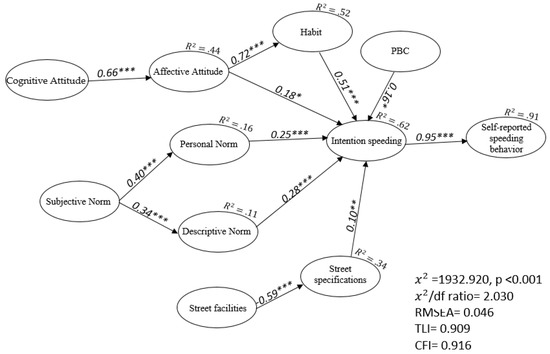 The indirect effects of affective attitude (β = 0.52, p < 0.001), habit (β = 0.49, p < 0.001), subjective norm (β = 0.18, p < 0.001), cognitive attitude (β = 0.35, p < 0.001), personal norm (β = 0.23, p < 0.001), descriptive norm (β = 0.27, p < 0.001), residential street facilities (β = −0.06, p < 0.05), PBC (β = 0.15, p < 0.01) and residential street specification (β = 0.10, p < 0.05) on self-reported speeding behavior is significant but not all of this relationship is strong. All of these factors were only indirectly associated with speeding behavior through speeding intention.