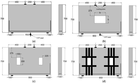 Cross-section and loading configuration for the experimental specimens. (a) Control sample details; (b) RC deep beam with one web opening at the center; (c) RC deep beam with two web openings at the center; (d) CFRP configuration details.