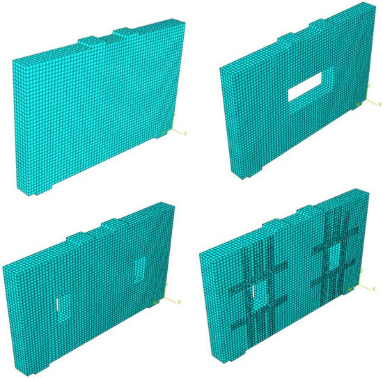 - Mohammed, B.; Bakar, B.H.A.; Choong, K. The Effects of Opening on the Structural Behavior of Masonry Wall Subjected to Compressive Loading-Strain Variation. Open Civ. Eng. J. 2009, 3, 62–73. [Google Scholar] [CrossRef]