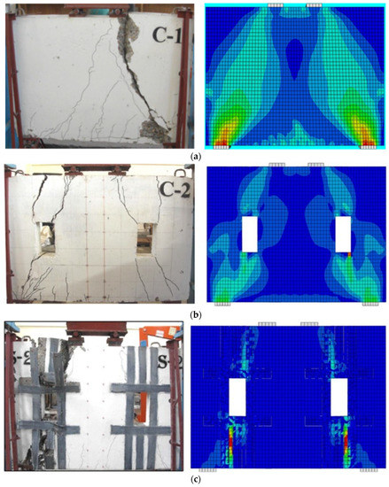 Regarding the specimen with two openings, strengthened with O-CFRP stirrups wrapping around the opening, the first strain distribution appeared at the adjacent sides of the opening when the specimen’s deflection reached 0.5 mm in the FE simulation. Simultaneously, the crack was visible in the experimental test when the deflection was about 0.35 mm, which may be attributed to the assumption of full bonding between the concrete and CFRP stirrups. It is followed by compression stress concentration between the region between perpendicular CFRP stirrups. As a result, the specimen failed by splitting concrete in the corners above and below the opening, as shown in Figure 4c. The damaged regions mainly occurred at the strut region between the loading and supporting plates as well as at the diagonally mirrored corners of web-opening across the compression strut. Consequently, it can be distinctly observed that the simulated configurations of failure modes in the FE model are consistent with the experimental findings.