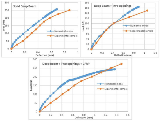 The modeled response was set to verify the ability of the selected model to capture the whole beam’s behavior up to failure and the influence of CFRP on structural performance. The model results can be used to validate and guide more numerical analysis investigation and explore concrete response under complicated loading conditions, such as the behaviors of reinforced concrete deep beams with/without web-opening.
