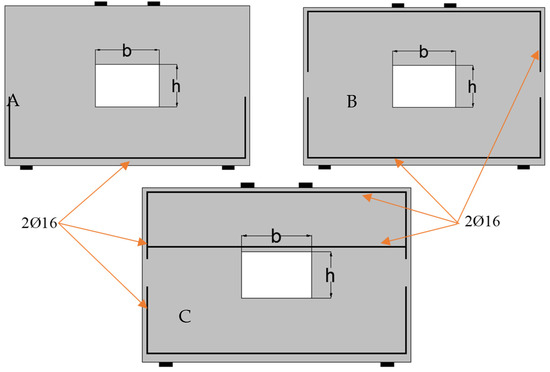 Details of opening ratio and reinforcement for specimens in groups A, B, and C.