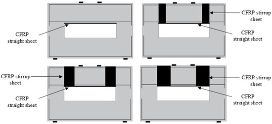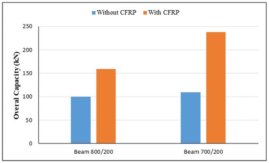 Finally, CFRP-sheet strengthening in the top face and CFRP-stirrups at the top region of the web-opening of RC deep beams has remarkably increased the beam strength, as shown in Figure 17. The maximum strength gain was 57% and 117% when the web-opening size was 800 × 200 and 700 × 200 mm, respectively, where most of the shear force was carried by the top chord that had wrapped with CFRP stirrup on both sides.