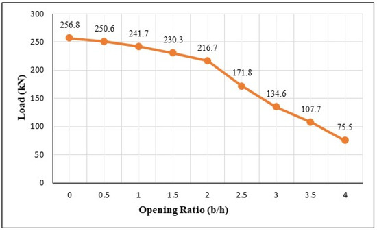 The observations of ultimate load capacity at the different opening ratios for the deep beam specimens in group A showed that the ultimate load of the solid beam is significantly more than that of the model with a web-opening, DA800, by 71%. The rational reason behind that is a lack in the beam web’s concrete mass resulting in a drop in the deep beam stiffness and its flexural strength. As shown in Figure 8, the ultimate load capacity of the solid deep beam is 256.8 kN, which is greater in comparison to the ultimate load capacity of other specimens DA100, DA200, DA300, and DA400, which is 250.6, 241.7, 230.3, and 216.7 kN, respectively. By considering the solid model result as a reference, it can be seen that the reduction in ultimate load capacity for the specimens with a web-opening ratio (b/h) of 0.5, 1.0, 1.5, and 2.0 (relative to the solid specimen) was 2.4%, 6.0%, 10.3%, and 15.6%, respectively. Furthermore, it was more obvious when the opening ratio (b/h) increased by more than 2.0. For instance, the ultimate load capacity of the specimens with (b/h) ratio of 2.5, 3.0, 3.5, and 4.0 (DA500, DA600, DA700, and DA800) was 171.0, 124.0, 107.0, and 75.0 kN, respectively. The reduction percentage compared to the solid model is 33.1%, 47.6%, 58.1%, and 71.0%, respectively. The drawn curve of load versus (b/h) ratio appeared to be bilinear, in which the first segment started from 0 to 2.0, while the other segment started from 2.0 to 4.0.