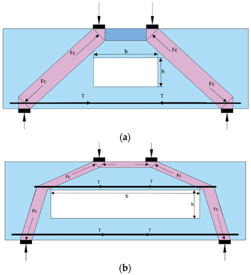 Strut-and-tie modeling (STM) is a unified approach that mirrors all load influences, including moment, axial and shear load, and tension force. Several studies showed that STM is an advantageous method for designing RC deep beams and predicting their structural behaviors [22,23,24]. The STM introduces a rational approach by analyzing a complex element into simplified truss models, as shown in Figure 1 [25]. In the STM approach, every design case study is unique and not similar to another; however, some rules and techniques help structural designers develop and solve these case studies [26]. This study will use the STM approach to explain and justify the RC deep beam behaviors and influence of CFRP when openings are introduced to the structural member.