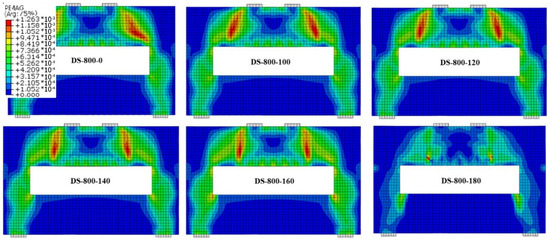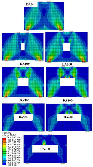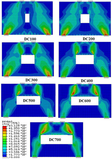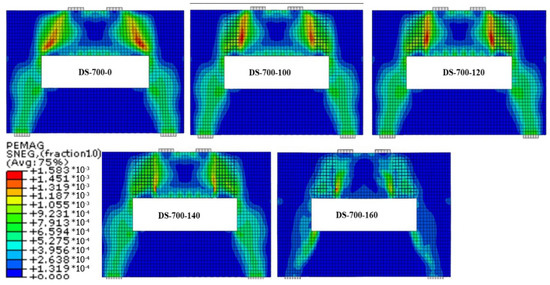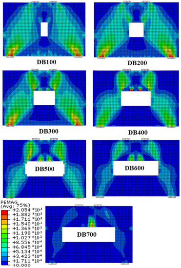 As shown in Figure 9, it helped to justify these two different behaviors. It can be postulated that the opening disrupted the strut when the width of the opening became more than 400 mm. Crossing the compression struts, developed between the applied load and the supports for the case of specimens DA400, DA500, DA600, and DA700, resulted in a substantial reduction in the structural performance and overall beam capacity, as depicted in Figure 9a,b. Therefore, the main observation is that if the opening width does not interfere with the load path and stress trajectories, i.e., compression struts, the overall performance of opening size is not predominant. In other words, once the percentage of opening width (b) over a distance between deep beam supports (L) is within 42%, structurally, there are no pronounced effects. Increasing the web-opening ratio (b/h) by more than 2.0 results in a shift in the failure path, leading to the failure stresses concentrated in the upper part of the web-opening, as shown in Figure 9b. Figure 10 illustrates the strain distribution for solid beams and beams with different opening web ratios and the same opening depth with various lengths. As shown in Figure 10, it can be seen from the models (DA0-DA400) that the compression strut has developed between the load and supports for specimens with a b/h ratio less than 2.0. The compression stresses, and compression strut, started to shift their direction and narrow down when the width of the opening began to widen, which was apparent in the model (DA400). The reduction in ultimate load capacity was no more than 15%, as shown in Figure 8.