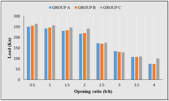 Because of increasing the web-opening size in the deep beam, the overall capacity of members has been reduced significantly. The members with a wide web opening, such as 500, 600, 700, and 800 mm, have behaved as two separate flexural beam members rather than one full deep beam member, as shown in Figure 8. As aforementioned, in group B, in addition to longitudinal reinforcement steel bars provided in the tension zone, such as in group A, a 2Ø16 longitudinal reinforcement bar was added to the compression zone, as shown in Figure 6 and Table 2. In group C, 2Ø16 longitudinal bars were used to reinforce the upper part of the opening in addition to the 2Ø16 longitudinal bars in the compression and tension zone, respectively. The results showed no significant contribution to utilizing the longitudinal reinforcement in the compression zone for group B. The deformation and failure mode of most samples did not alter the results compared to the members of group A. Figure 11 presents the maximum applied load versus opening ratio (b/h). It can be seen that the failure load of groups A and B are almost identical. The outcomes were expected because the reinforcement detail in group B did not mitigate the main issue, which has a redistributed tension stress in the upper part of the opening. As shown in Figure 12, the strain distribution of group B is similar to the strain distribution of group A. This mechanism of failure occurred due to the stress concentration at the mid-span above the web opening leading the members to fail in a flexural manner, with a lower value of ultimate load capacity in comparison with the member without web-opening.