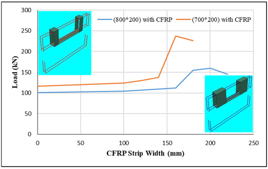 As aforementioned in Section 3.2, ABAQUS software was used for simulating the behavior of deep beams strengthened with CFRP for investigating the effect of CFRP reinforcement. A CFRP strengthening technique has been used in a deep beam with a large web openings ratio, i.e., DB700 and DB800. As shown in Figure 6, a straight one-layer with varying stirrup widths of CFRP has been applied to the region above the web-opening specimens. The reason for choosing the opening with 700 and 800 mm is that these two specimens showed the lowest strength. It is also to observe the effects of CFRP in providing additional strength and redistributing the strain concentration from the upper part of the member to the supports.