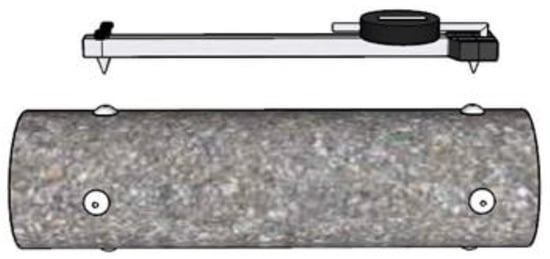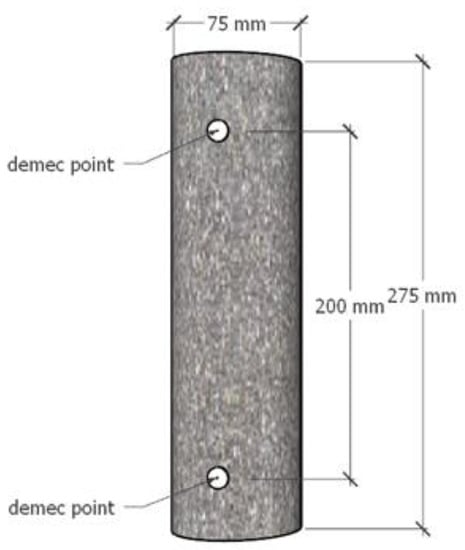 Three cylinder specimens with a diameter of 75 mm and a height of 275 were cast for each mix. The slenderness of each specimen was within the range specified in the RILEM Recommendation []. On the following day after casting, the specimens were demolded and the specimens were wrapped with a dry cloth to remove any excess moisture on the surface of the specimens. Subsequently, four pairs of demec points were attached on the surface of the specimens at an equidistance of 90°. The gauge length of the demec points was 200 mm (see Figure 2). This length was assigned as an initial length (L) before shrinkage occurred.