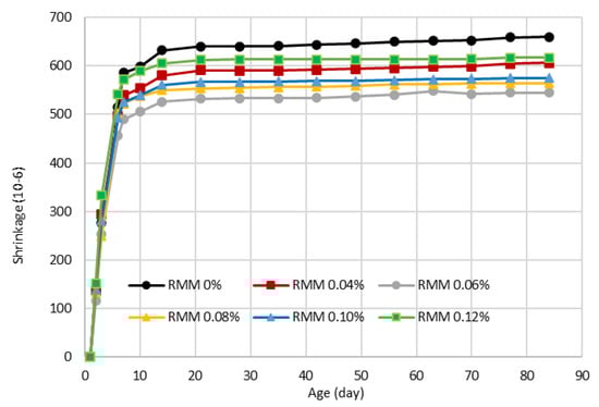 Shrinkage originates from the cement paste, while the aggregate is considered an inert material. Nevertheless, it has been shown that the composition of the mixture contained in the mortar/concrete affects the magnitude of shrinkage. For example, it was found that the addition of polypropylene fiber at 0.1% and 0.2% content could reduce the shrinkage of high-performance concrete []. It is also shown that the addition of a non-alkaline accelerator can increase shrinkage during the initial drying period [].