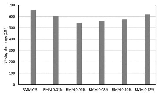 In the meantime, the influence of adding micro-synthetic fibers can also be observed from Figure 4. Generally, the fibers reduce the magnitude of the shrinkage but they do not affect the shrinkage rate. The influence of fiber can be explained via the following mechanism: once the mortar shrinks, shear stress is induced between the fiber and the surrounding mortar. This shear stress, in turn, influences the mortar deformation behavior, resulting in macroscopic composite shrinkage lower than that of a pure cement-based mortar []. The influence of fibers on the shrinkage depends on the fiber volume fraction. Based on the 84-day shrinkage value shown in Figure 5, a fiber dosage of 0.06% gives the greatest reduction of the shrinkage. This finding is in agreement with Bandelj et al. [], who noted that with an increase in the fiber content, the shrinkage was reduced only up to a certain fiber content. An excess of fiber content would result in poor workability and shrinkage.