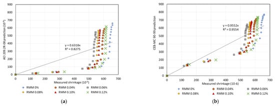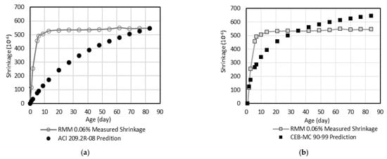Comparison between the measured shrinkage and the predicted shrinkage by ACI 209.2R-08 (a) and CEB-MC 90-99 (b) models.