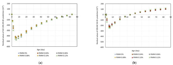 Evaluation of the modified ACI 209.2R-08 (a) and the modified CEB-MC 90-99 (b) models by residual analysis.