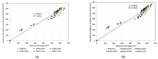 Comparison between the measured shrinkage and the predicted shrinkage by the modified ACI 209.2R-08 (a) and the modified CEB-MC 90-99 (b) models.