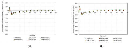 Figure 9 shows examples of the comparison between the curves of the measured shrinkage and the predicted shrinkage using the modified ACI 209.2R-08 and the modified CEB-MC 90-99 models. The figure indicates that the shrinkage behavior of the micro-synthetic fiber-reinforced mortar can now be estimated quite accurately using the modified models. Figure 10 and Figure 11 demonstrate the improved correlation between the measured shrinkage and predicted shrinkage when it is assessed using the best fit line and residual analysis method, respectively. Meanwhile, Table 4 summarizes the quantitative improvements of the modified models compared to the originals.