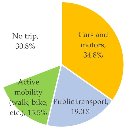 Still, in the case of trips to work/school, the share of car trips accounted for 50%, walking/biking for about 22%, and public transport for the remaining 28%. In total, the 4.8 million inhabitants over 16 years old analyzed in the survey generated 2.9 million trips to work and 0.5 million trips to school in a representative workday (return trips were considered separately and their number slightly differed because of round trips); therefore, only 30.8% of the population did not generate any trips, meaning they either worked from home or were not employed (including being unemployed and retired) (see Figure 2). The remaining ca. 70% traveled to work or school. This means that working from home was not very popular. Based on the survey, we can also calculate that ca. 35% of the total population traveled to work/school by car and ca. 29% by public transport. In total, over 50% of the surveyed 16+ population traveled to work/school by a motorized means of transport, which probably took them outside their neighborhood (otherwise, they would have walked/biked as did the remaining ca. 15.5% or “stayed at home” as did 31%).