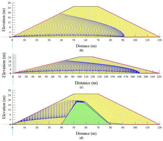The general outlook of the investigated embankments (a) 1:1 (V:H) slope, (b) 1:2 (V:H) slope, (c) 1:4 (V:H) slope, and (d) 1:2 (V:H) slope with a core.