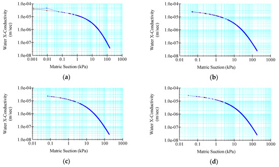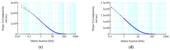 Figure 3 presents a summary of the water conductivity in the horizontal direction vs. matric suction. It should be noted that the concept of matric suction emerges as a pivotal soil parameter, wielding a profound influence over the intricate behaviors of unsaturated soils, encompassing shear strength and permeability characteristics. This fundamental property, arising from the dynamic interplay between pore water and the solid matrix, imparts a remarkable ability to unsaturated soils, enabling them to retain moisture against the forces of gravity, thereby defying conventionally anticipated patterns of flow and drainage. By virtue of matric suction, unsaturated soils attain an exquisite balance between attractive and repulsive forces acting within their pore spaces, thereby culminating in a fine equilibrium that governs their response to external stresses and loads. Moreover, the intricate interplay between matric suction and soil particle interaction underlies the intriguing phenomenon of capillary rise and its corollary, capillary fall, wherein the ascendancy and subsidence of liquid in narrow capillaries counterintuitively transgress the conventional gravitational flow regime.