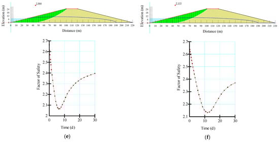 Trends in the factor of safety values for (a) 1:1 (V:H) without toe drain and instantaneous drawdown (b) 1:1 (V:H) without toe drain and 10-day drawdown (c) 1:1 (V:H) without toe drain and 1 m per day drawdown (d) 1:4 (V:H) with 30 m toe drain and instantaneous drawdown (e) 1:4 (V:H) with 30 m toe drain and 10-day drawdown (f) 1:4 (V:H) with 30 m toe drain and 1 m per day drawdown.