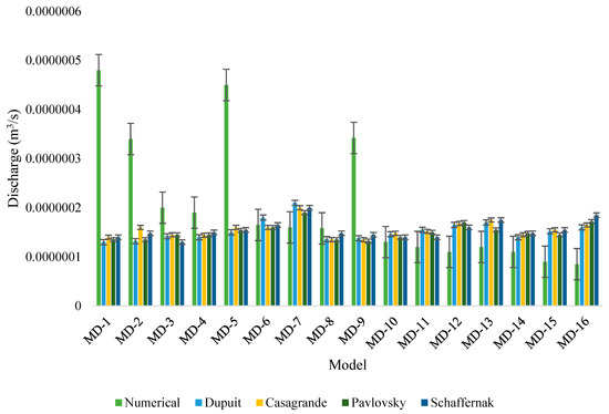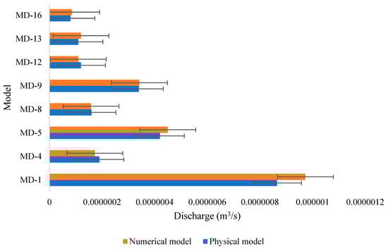 An examination of seepage discharge was additionally carried out, involving a comparison between the physical models and numerical simulations. Within this phase of the study, a total of eight physical models were utilized. Figure 6 presents a concise overview of the outcomes stemming from the seepage discharge analysis. Notably, the analysis revealed that the greatest seepage discharge was observed in model 1, characterized by a 1:1 (vertical to horizontal) embankment slope without a toe drain.