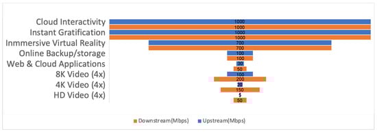 Three commonly adopted fixed broadband technologies—DSL, Cable, and Fiber—offer varying speed ranges as shown in Table 4, with Fiber broadband providing the fastest speeds. Fiber broadband has seen significant advancements in recent years, with AT&T introducing a 5Gbps Fiber broadband service in the US since late 2022 [28]. On the other hand, wireless broadband services primarily rely on cellular technologies like 4G LTE and 5G. A 2021 report [29] indicated that the average download and upload speeds for 4G LTE services from major US carriers ranged from 10 to 30 Mbps and 7 to 15 Mbps, respectively. While the latest 5G cellular service boasts a theoretical maximum speed of 20 Gbps, practical speeds in the US currently hover around 50–150 Mbps [30], and its coverage remains somewhat limited. This substantial speed gap between fixed and wireless broadband services is a global trend. Worldwide, the average download and upload speeds for mobile broadband are approximately 42 Mbps and 10.3 Mbps, respectively, while fixed broadband averages around 80.1 Mbps and 30.1 Mbps, respectively [31].