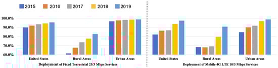 Of greater significance, Figure 3 reveals a substantial increase in the deployment ratio of the 4G LTE network, rising from 82.2% to 97.4% over a five-year period culminating in 2019, while fixed broadband service increased from 89.9% to 95.6% within the same timeframe. This underscores the ability of 4G LTE networks, and cellular networks in general, to rapidly expand their services to the American populace [27]. A closer examination of the deployment ratio breakdown in urban and rural areas reveals that this advancement was mainly achieved in rural regions, aligning with our expectations. In light of this data, it becomes evident that wireless mobile broadband holds a distinct advantage in terms of accessibility when compared to fixed broadband.