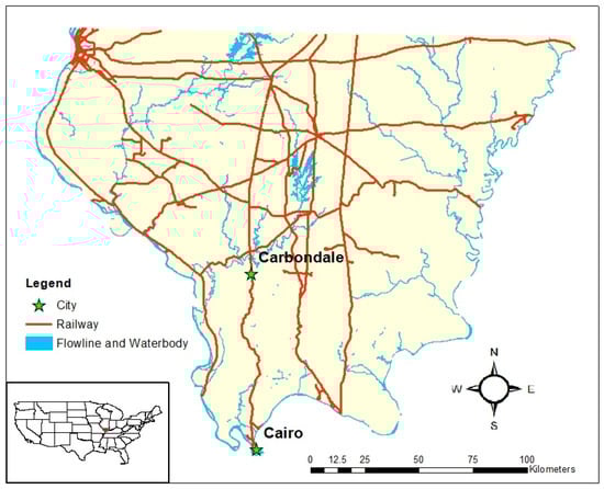 To demonstrate challenges and opportunities of the current wireless network infrastructure in rural regions, we collected wireless network quality data in two rural towns in Southern Illinois, Carbondale and Cairo, as shown in Figure 4. Carbondale is the largest city in Southern Illinois, with a population of 21,857 in 2020. Cairo, located at the southernmost tip of Illinois, is the only city in the state that surrounds a flood levee. It had a total population of 1733 in 2020. Both communities in their entirety or partly had extreme poverty, defined as a poverty rate of 40.0 percent or more for the period 2015–2019.