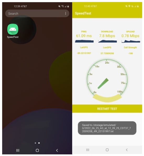 To accurately measure mobile wireless network speed, we created an Android application capable of assessing real-time network performance from the perspective of user experiences. The graphical user interface (GUI) of our testing application is depicted in Figure 5. We developed the app using Ookla’s internet speed service as the underlying framework [38]. The application conducts download and upload tests, each lasting 15 s. Upon completion of these tests, the app calculates the network speed by analyzing the volume of data downloaded and uploaded during the specified time frame.
