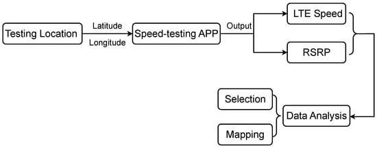 In addition to network speed, we also utilized RSRP as a key performance indicator. RSRP is measured in decibels milliwatts (dBm), ranging from 0dBm (indicating the best signal) to −110 dBm (indicating the weakest or no signal). RSRP characterizes the strength of the wireless signal in an LTE network and is a requirement for physical layer measurements) [39]. It is the average value of the received signal power over all Resource Elements (REs) carrying a reference signal within a specific symbol. Although some devices display Received Signal Strength Indicator (RSSI) alongside RSRP for LTE connections, RSRP is generally considered a more accurate measure of signal strength. Table 5 shows how different ranges of RSRP correspond to differential signal strength. Our case studies followed the steps shown in Figure 6.