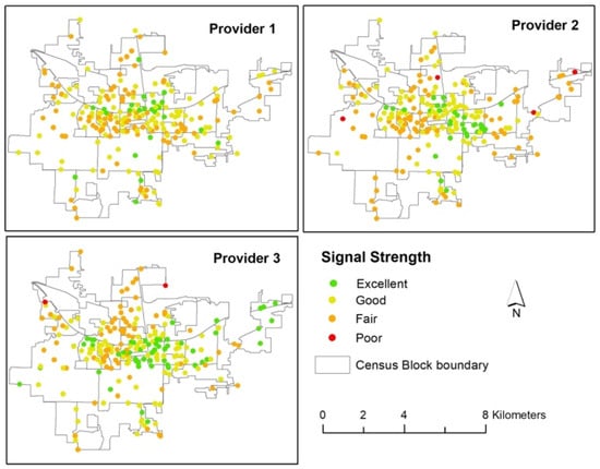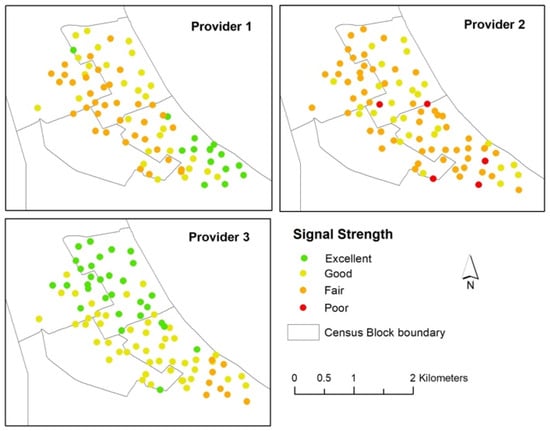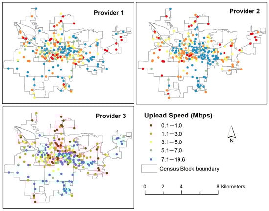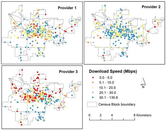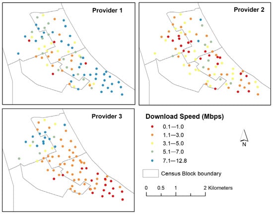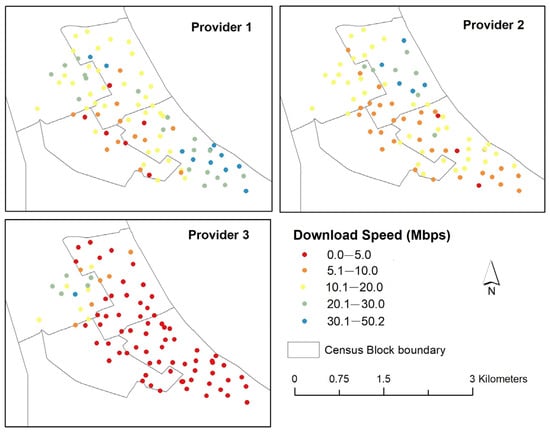 To avoid unintended debate on service quality comparison (which is irrelevant to this paper), we used Provider 1, 2, and 3 as pseudo names to represent the three major service providers in the testing area that were adopted in this study. To better present the results, we visualize the speed measurement results on city maps (i.e., Figure 7, Figure 8, Figure 9, Figure 10, Figure 11 and Figure 12) and use tables to present aggregated data at the census block level (i.e., Table 6 and Table 7).