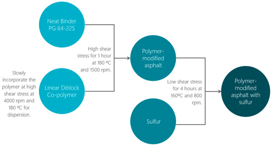 The neat asphalt binder used in this study was classified as PG 64-22S, according to Superpave performance grading (PG). Its physical properties, such as softening point and penetration (25 °C), and rotational viscosity (135 °C), are 50.1 °C, 39.3 10−1 mm, and 0.4725 Pa-s, respectively. For the polymer modification of the asphalt, a thermoplastic elastomer consisting of a linear diblock copolymer composed of blocks of styrene and butadiene with a polystyrene content of 33% was used. The sulfur used as a crosslinking agent was a minus 100-mesh powder with 99.5% purity.
