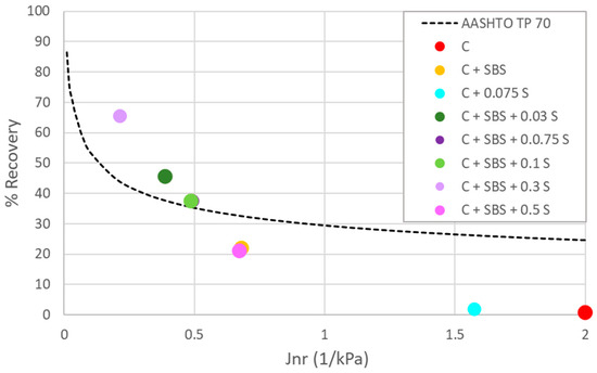 Figure 2 visually illustrates the outcomes of the polymer modification and introduction of sulfur into PMA. The control sample, as expected, has a low %recovery and does not meet the minimum value for its Jnr when tested at 3.2 kPa shear stress, according to the AASHTO TP 70 [46] criteria, indicating that the binder is not polymer-modified. Only the samples of PMA with added sulfur (0.03, 0.075, 0.1, and 0.3%) have a significant elastic response, which suggests that the presence of sulfur helps the polymer modification efficiency in terms of elastic recovery.