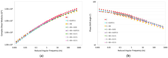 In this work, dynamic shear modulus (|G*|) and phase angle (δ) master curves were used to describe the sulfur’s influence on the modified asphalt binder’s behavior. The binders’ |G*|and δ values were determined by performing a frequency sweep at various temperatures through the DSR, using the 8 mm parallel plate geometry and 2 mm gap. For each temperature, 16 measurements were obtained by executing a frequency sweep spanning from 100 to 0.1 rad/s [47]. The curves were constructed using the Christensen–Anderson model, and the shift factor was calculated based on the Williams–Landel–Ferry (WLF) time–temperature superposition principle for a reference temperature of 15 °C.