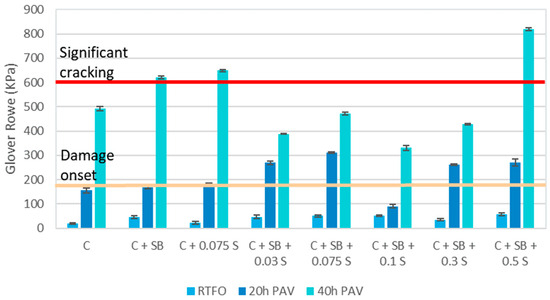 The impact of sulfur as a delaying agent for PMA aging is observable through an analysis involving the Glover-Rowe parameter and aging indexes. As the sample undergoes aging, it becomes increasingly brittle and susceptible to cracking, a phenomenon reflected in the rising values of the G-R parameter, as shown in Figure 4. Short-term aging impacts the G-R parameter, but it is the extended service life, simulated through one or two 20 h PAV-aging cycles, that substantially increases the likelihood of cracking occurrence. The initial modification of the binder with polymer increased its susceptibility to cracking after short- and long-term aging, and adding sulfur up to 0.3% could reduce the effects of aging on PMA. The parameter exhibited its highest value at 0.5% wt. of sulfur in PMA, indicating that beyond a certain threshold, an excess of sulfur can actually detrimentally impact aging susceptibility.