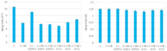 Figure 5 illustrates the impacts of aging on the binder’s complex modulus (G*) and phase angle as an aging index. This index represents the ratio between the rheological parameters before and after the aging process. A lower value indicates less susceptibility to aging. It is therefore inferred that adding sulfur to the asphalt–polymer blend, up to 0.3% wt., effectively mitigates the aging susceptibility of PMA, as is evident from the notable reduction in the aging indexes. Furthermore, it is crucial to underscore the critical role that the quantity of sulfur assumes in directing these alterations. The most optimal formulation emerges at a sulfur content of 0.1%, in agreement with the Glover-Rowe parameter analysis.