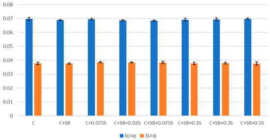 Figure 7 presents the calculated values of Ic=o and Is=o for the PAV-aged samples, as determined by Equations (4) and (5). However, a consistent trend is observed across all samples, indicating that no new functional groups were generated as a result of the different formulations, and no significant change was observed. Thus, there is no reason to conclude that sulfur accelerates or mitigates the formation of carbonyls and sulfoxides.