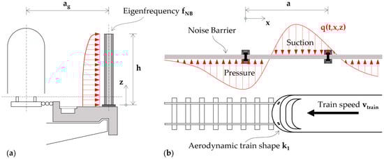 Air pressure waves caused by trains create a sinusoidal dynamic loading at the train head, train tail, and train coupling points, resulting in pressure and a suction load acting on NBs, as shown with red colour in Figure 1. The size of dynamic loading depends on the aerodynamic shape of the train k1, the speed of the train vtrain, the wall height h, and the eigenfrequency fNB of the NB construction as well as on the distance of the track axis to the surface of the noise barrier denoted as ag. Because of the impulsive sinusoidal shape of the air pressure and suction wave, a dynamic amplification of the NB deflection occurs [], and its size is defined using the shock factor φdyn given in EN 16727-2-2 []. The dynamic amplification can become a factor of up to φdyn = 3.25 in the most unfavourable case. Until 2005, train-induced aerodynamic loading has not been adequately considered in the design of NB as well as in the applied calculation methods (pure static analysis with proof of load capacity) and in the relevant normative specifications given in Eurocode EN 1991-2 []. Causes for the resulting fatigue damage of NB components (aluminium panels) have been investigated in [,].