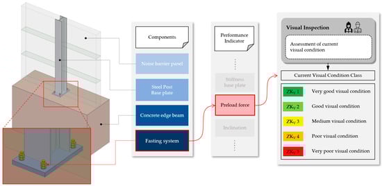 The combination of the various levels outlined above is based on the classic performance and key indicator concept as described in []. An important performance indicator, which can only be partially assessed via visual inspection, is the stress variation range in the cross-section of the threaded bolts. It can be used to determine the degradation process of the fastening system anchored in the concrete edge beam. In particular, the installation conditions, such as the preload force of the threaded bolts, but also unavoidable inclinations, flaws, displacements, and surface conditions of the individual components of the fastening system can be mapped in this indicator.