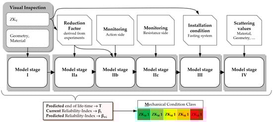 In the proposed holistic assessment framework, information from different sources, such as conventional visual inspections, monitoring systems, and numerical models, are linked together to increase the accuracy of the condition assessment and prediction of the remaining useful lifetime. The four model stages indicated in Figure 4 are activated one after another. Each individual activation is conducted when a certain corresponding condition state threshold is reached. With each activation, a new source of information is added to the calculation, through which the precision of the condition-state determination and prognosis of the remaining useful lifetime is increased. The core elements of each model stage are the currently applied standard methods of visual inspection with its resulting condition classes (ZKV) and fatigue calculations, according to RVE 04.01.01 [], currently carried out only in the design processes of new NB constructions. In a subsequent step, this calculated fatigue, or, in other words, the end of a lifetime, is put into a reliability index framework, which allows for the consideration of consequence classes. Finally, through discretisation into the mechanical condition classes ZKM 1 to ZKM 5, a maintenance strategy can be developed. With each model stage activation, the accuracy of the condition assessment and prediction of the remaining useful lifetime is increasing but so is the effort the infrastructure manager has to put in.