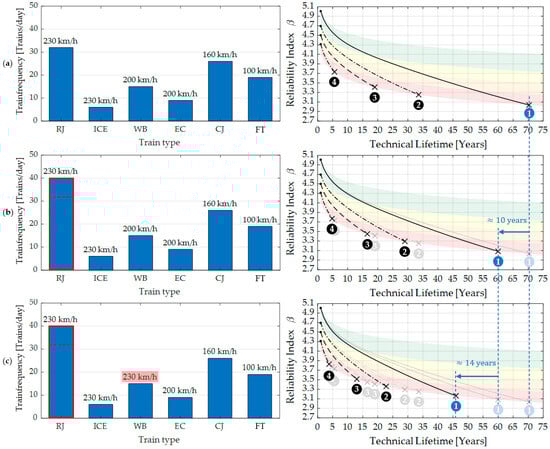 The monitoring of the action side via axle load monitoring systems can be performed at certain checkpoints along the railway network []. This action-sided monitoring system collects the time series of axle loads and the speeds of passing trains. By analysing these recorded time series using machine learning algorithms, among other methods, train speeds, train types, and number of trains can be extracted, and subsequently, accurate load collectives can be grouped. The sensitivity of those action-sided parameters is shown in Figure 5a–c, where three different cases are depicted. The three cases, (a), (b), and (c), are based on a load collective typical for the Austrian railway network. This typical load collective describes the number of trains (train passages per day) with the average train speed for six different train types. This typical load collective is composed of 32 trains per day of the type Railjet (RJ) with an average speed of 230 km/h, 6 trains per day of the type Intercity-Express (ICE) with an average speed of 230 km/h, 15 trains per day of the type Westbahn (WB) with an average speed of 200 km/h, 9 trains per day of the type Eurocity (EC) with an average speed of 200 km/h, 26 trains per day of the type Cityjet (CJ) with an average speed of 160 km/h, and 19 trains per day of the type freight train (FT) with an average speed of 100 km/h. Each train type corresponds to a specific aerodynamic shape factor k1, where the train type ICE shows the most favourable, with k1 = 0.6; train type RJ is medium favourable, with k1 = 0.85; and train type FT, CJ, EC, and WB have the most unfavourable factor, with k1 = 1.0. Starting with this typical load collective in case (a), the technical lifetime is calculated for four different scenarios numbered from 1 to 4. Scenario 1 describes a fastening system with visual condition class 1, which refers to sufficient preload force and, therefore, a maximum reduction in the stress variation range. Scenarios 2, 3, and 4 describe fastening systems with visual condition classes 2, 3, and 4, which, respectively, refer to a gradually reduced preload force to almost non-existent and, therefore, a minimum reduction in the stress variation range in the threaded bolts. The reduction factors, shown in Table 1, were roughly derived from the experiments conducted in []. Further laboratory, as well as numerical, experiments are necessary to calibrate these first approach factors.